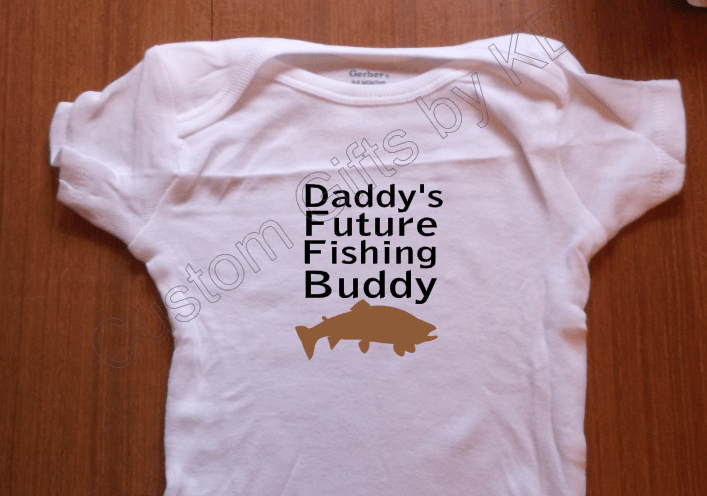 Daddy’s Future Fishing Buddy Custom Onesie, great gift for that new dad, or that special hunter you know that is or has a child :). I personally design each baby onesie, let me know if there is a different design you are looking for and I will be happy to do that for you ? These do snap shut on the bottom with 3 snap closures.